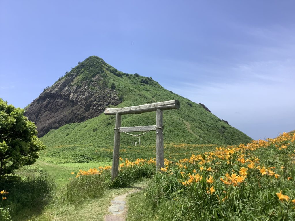 しばらく散策していたところ、急に青空が広がりました。一面に咲き誇るトビシマカンゾウもさることながら、悠然と構える大野亀の姿が壮観で清々しい気分になります。