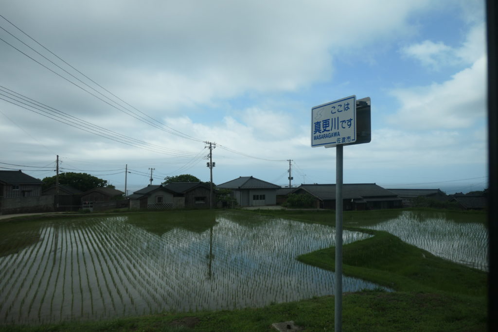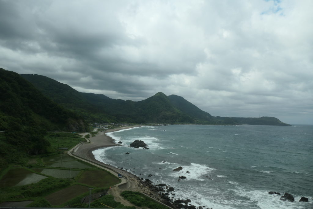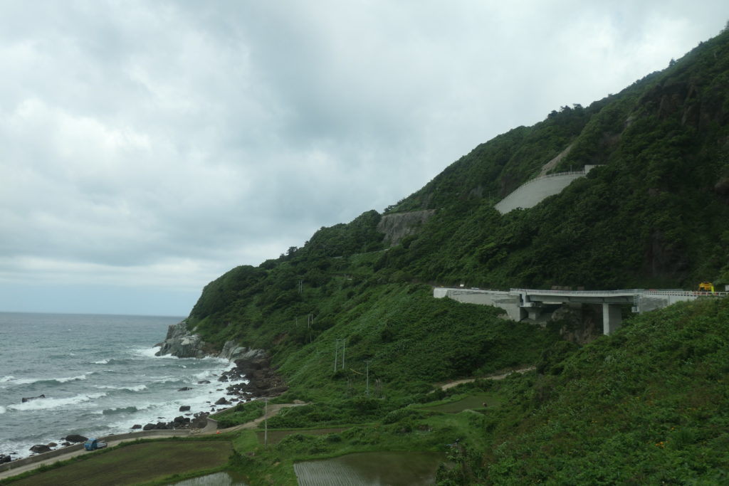 階段を駆け上がってSADO二ツ亀ビューホテルに着くと、5人ほどがバスを待っていました。大野亀からの乗客と合わせて10人あまりを乗せたバスは両津へひた走ります。たっぷり歩き回ったおかげで気付けばもう両津港でした。