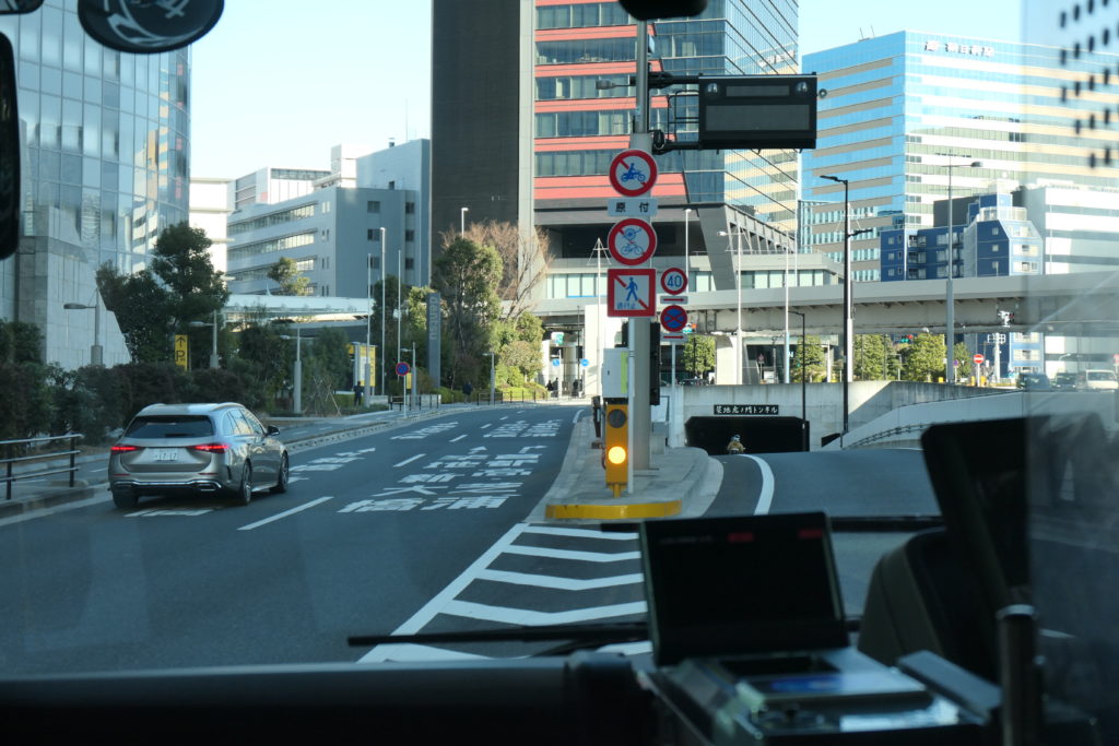 まずは旗艦となる幹線ルートに乗ってみます。新橋~国際展示場を一直線に結び、日中は10分間隔で運転。平日朝の一部便のみ虎ノ門ヒルズに直通するほか、土休日は一部が東京テレポートまで足を延ばします。