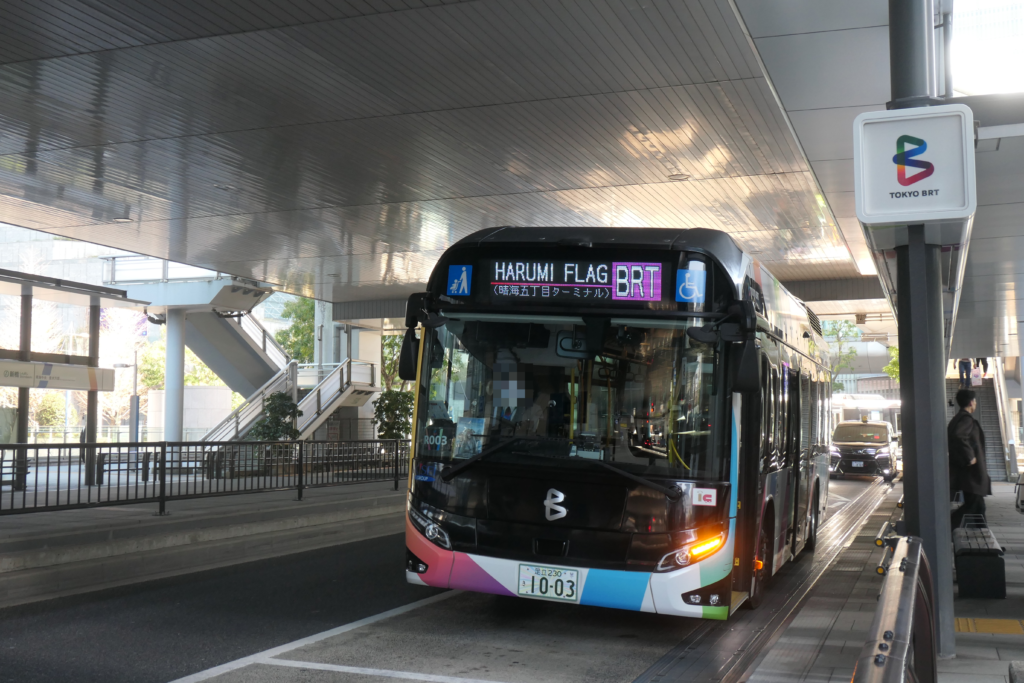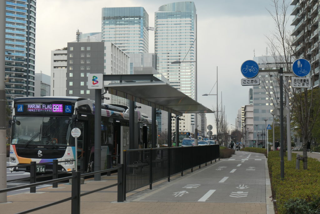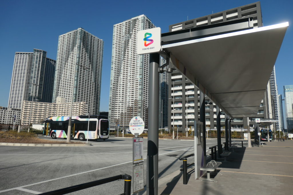 つづいて乗車するのは選手村ルート。日中は15分間隔で運行され、都営バス都05-1系統とともに、東京五輪の旧選手村であるHARUMI FLAGの主たる交通手段となっています。