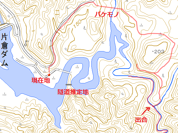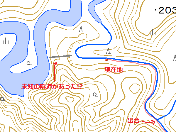この先は沢の蛇行がひときわ激しくなっており、隧道も疑われる地形でしたが、焦っていたため確認はせず。写真を振り返ってみると、何やら隧道がありそうな黒っぽいところがいくつかあるように見えます。いくら時間なかったからってなんで確認しなかったんだ…。普段は見られない光景かもしれないんだぞ…?