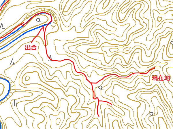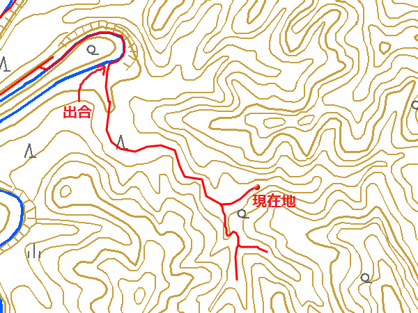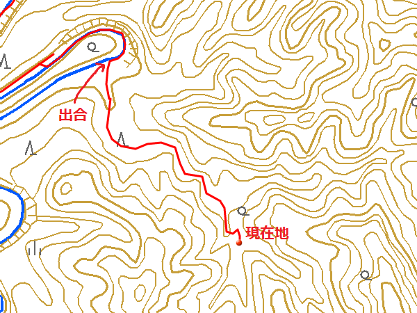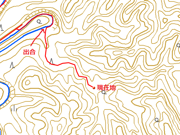 この地点で撤退を決意しました。探索の気力が失せていた我々はこの手前の支谷を調べることすら省略。今考えれば一応確認しておけば良かったのですが、探索時は痕跡の出そうにない沢歩きにいよいよ嫌気のピークを迎えていたのです。