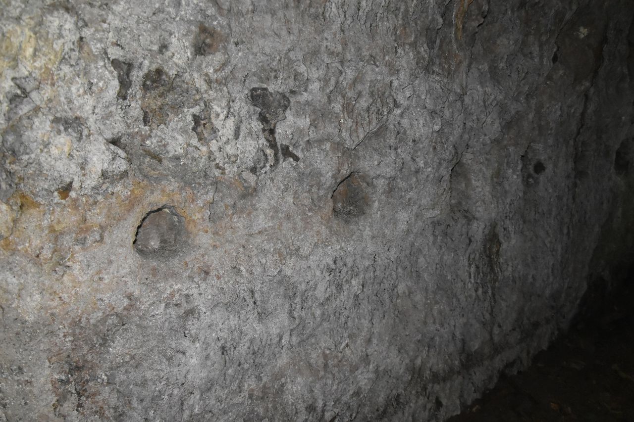 まず、孔は確実に存在していました。隧道中央部では確認できませんでしたが、端部では連続的に穿たれた孔を発見するに至りました。