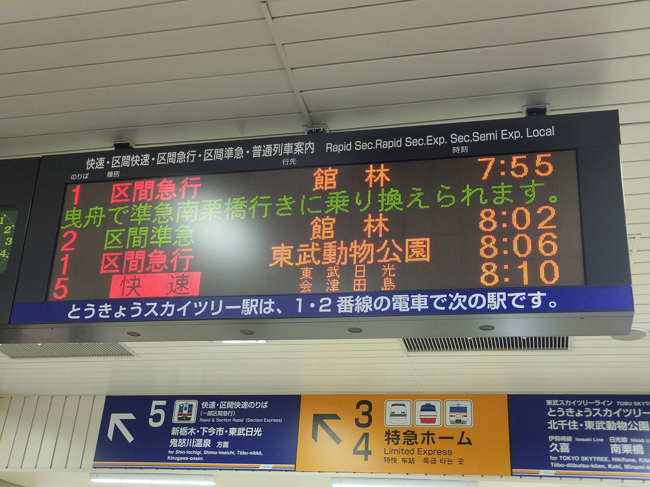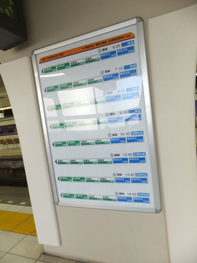 改札の目の前に停車しているスペーシアには目もくれず5番線ホームへ。普通列車が1,2番線を使うのに対し、快速・区間快速は若干浮いているような気がします(まあ快速・区間快速は長距離列車のカテゴリーなので、普通列車と違っていて当たり前ではあるのですが)。