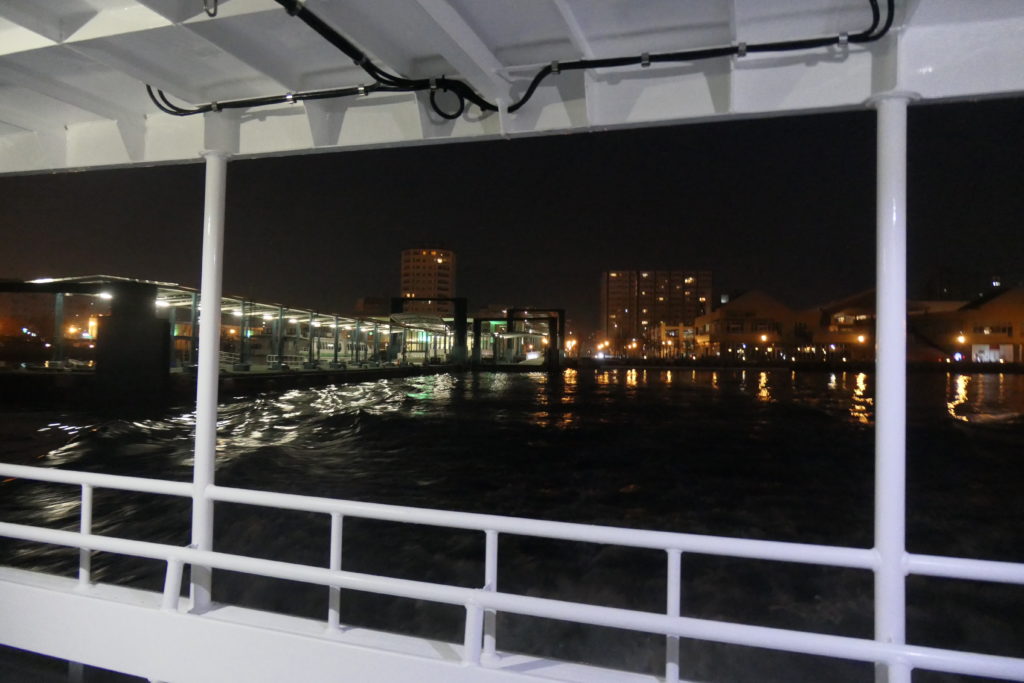 ふいにエンジン音が落ち着いたので外へ出ると、港の明かりが現れました。