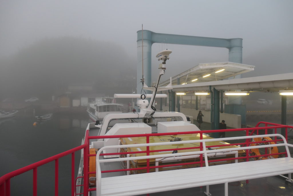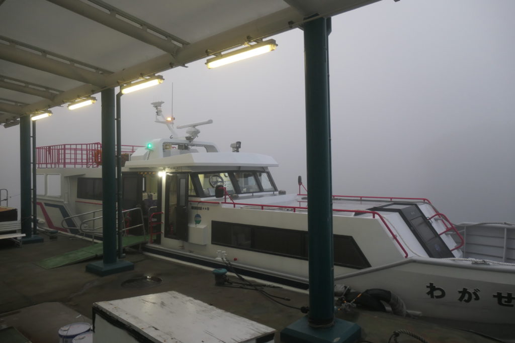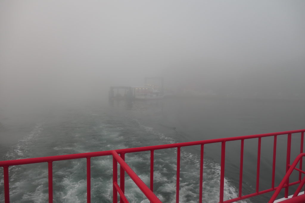 出航するや、辺りは一面靄に包まれて何も見えなくなりました。船のエンジン音だけがけたたましく鳴り響きます。エンジン不調のせいか、デッキに立っているとブルブル振動が伝わってくるので、仕方なく客室内で過ごすことに。