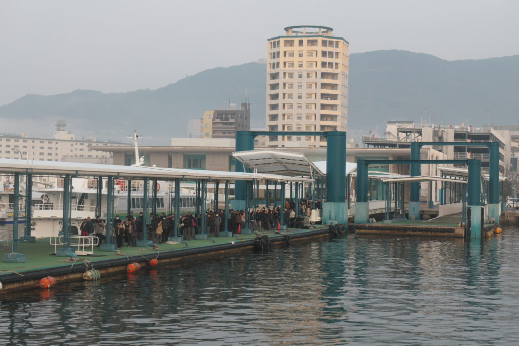 桟橋に目を移すと、ミチミチに行列ができていました。ざっと100人近くいるでしょうか。大島行きの西海沿岸商船を待つ方々のようです。大島にある大島造船所への通勤輸送は西海沿岸商船の生命線となっています。