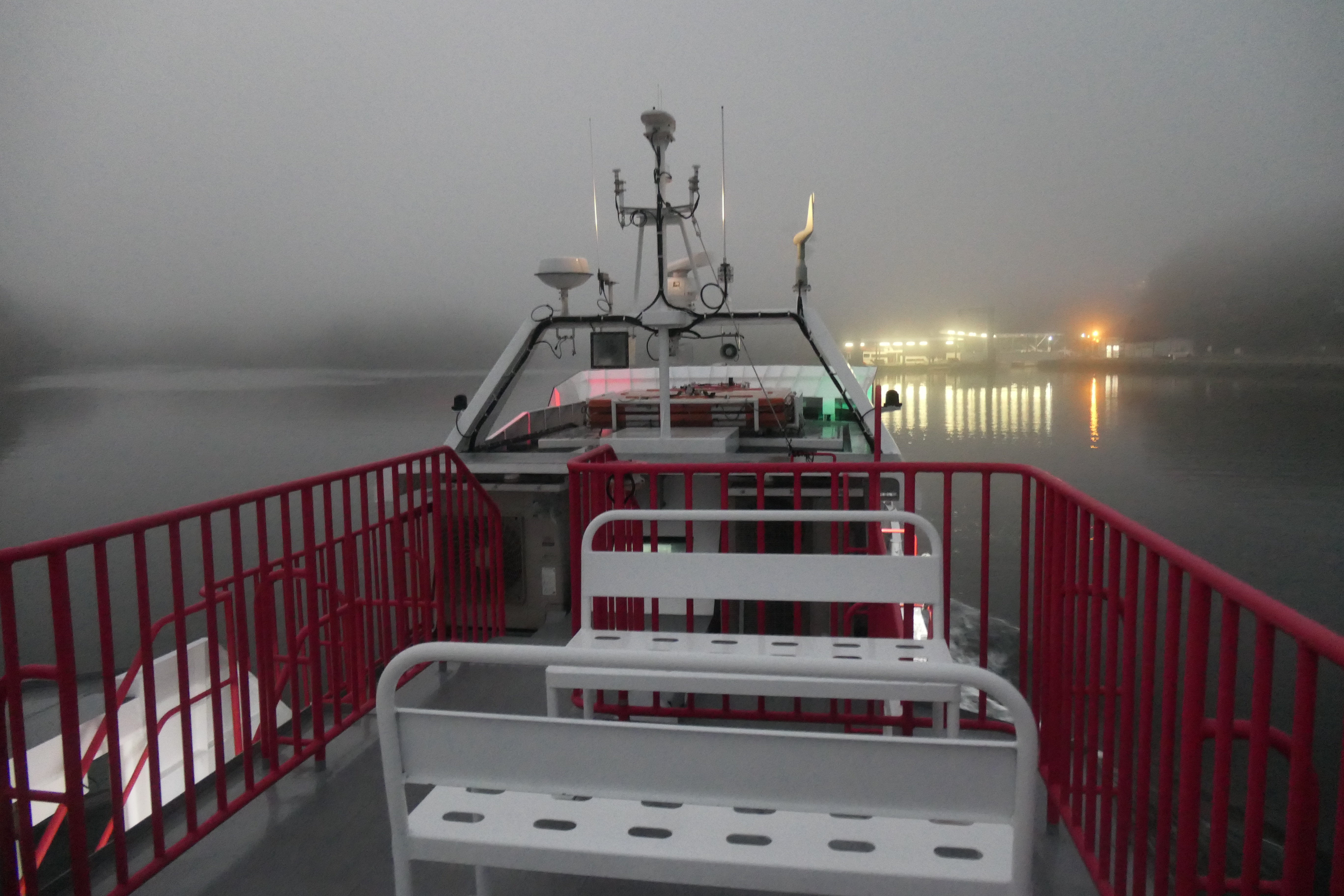 出航するや、辺りは一面靄に包まれて何も見えなくなりました。船のエンジン音だけがけたたましく鳴り響きます。エンジン不調のせいか、デッキに立っているとブルブル振動が伝わってくるので、仕方なく客室内で過ごすことに。
